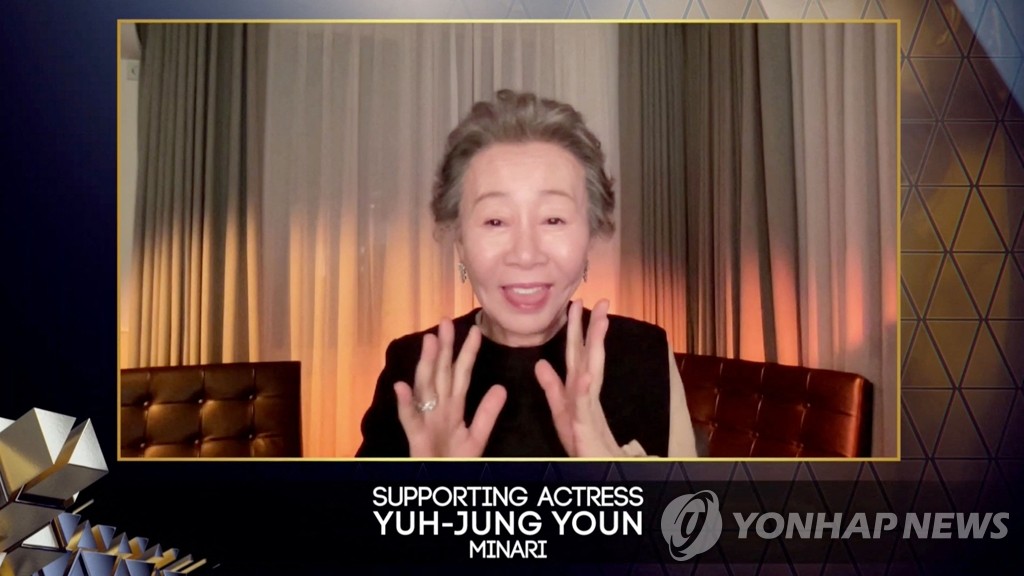 | ▲ 영국 아카데미 여우조연상 수상 소감 밝히는 윤여정 (런던 AFP=연합뉴스) 배우 윤여정이 지난 11일(현지시간) 영국 런던의 로열 앨버트홀에서 비대면으로 개최된 제74회 영국 아카데미(BAFTA)상 시상식에서 영화 '미나리'로 여우조연상을 수상하고 화상을 통해 소감을 전하고 있다. [BAFTA 제공. 재판매 및 DB 금지] |