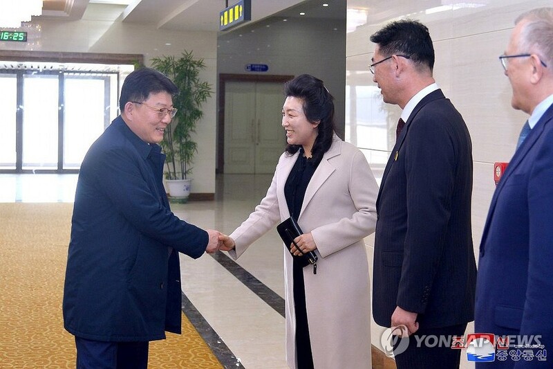 | ▲ North Korea's External Economic Relations Minister Yun Jong-ho (L) is greeted by officials after arriving in Pyongyang from a trip to Russia on April 2, 2024, in this photo released by the Korean Central News Agency the following day. (For Use Only in the Republic of Korea. No Redistribution) (Yonhap) |