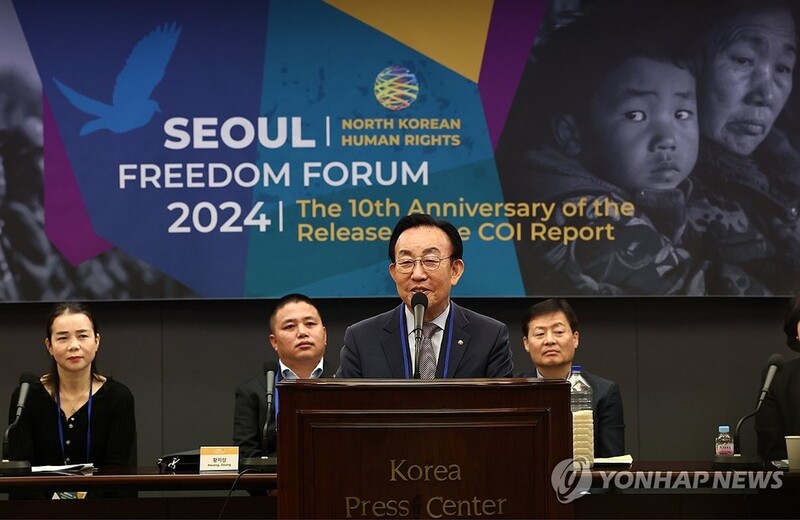 | ▲ This file photo, taken Feb. 19, 2024, shows Kim Kwan-yong (C), executive vice chairperson of the Peaceful Unification Advisory Council, speaking at a forum on North Korea's human rights in Seoul. (Yonhap) |