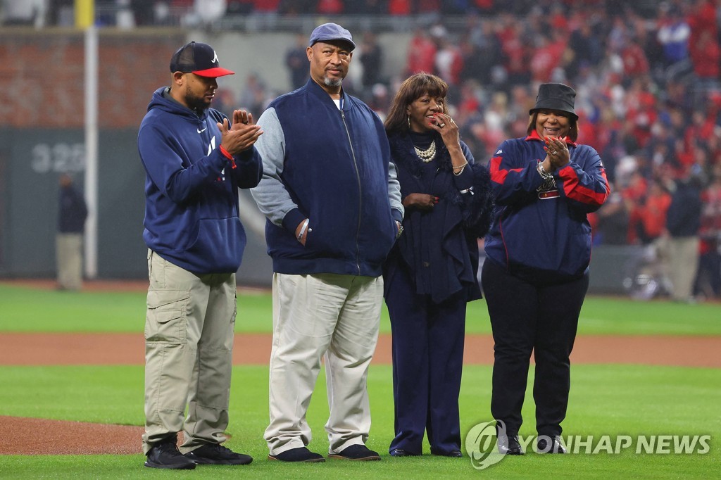 | ▲ 월드시리즈 3차전에 앞서 열린 행크 에런 특별 헌정식에 등장한 에런의 가족 [게티이미지/AFP=연합뉴스 자료사진] |