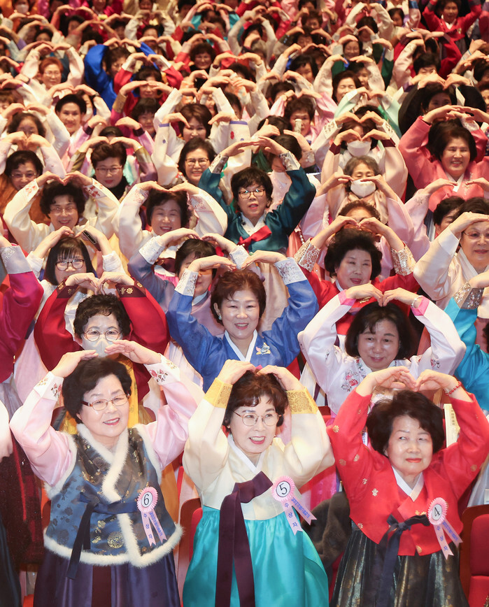Graduates form hearts with their hands as a token of gratitude during a graduation ceremony at Ilseong Women's Middle and High School in Seoul on Feb. 25, 2025. The school with a two-year course is open to nontraditional students aged 40 and older who have not received regular education. (Yonhap)