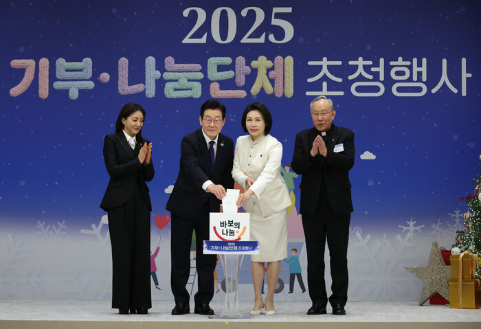 President Lee Jae Myung (2nd from L) and his wife, Kim Hea Kyung (2nd from R), put an unspecified donation into a collection box of the charity group Babonanum during a donation campaign event at the presidential office in Seoul on Dec. 16, 2025. (Yonhap)