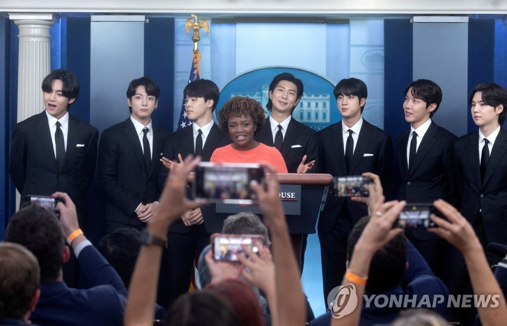 검은색 정장 차림의 BTS는 카린 장-피에르 대변인과 함께 다소 긴장된 표정으로 기자실 문을 열었습니다. 평소 진지하고 냉철한 질문과 답변이 오가기로 유명한 백악관 브리핑룸은 이때까지만 해도 별다른 반응 없이 차분한 분위기였습니다.