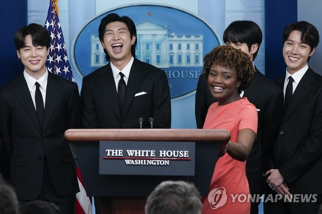 | ▲ 백악관 브리핑룸에서 환하게 웃는 BTS RM (워싱턴DC AP=연합뉴스) 미국 워싱턴DC의 백악관에 초청받은 방탄소년단(BTS)의 RM(가운데)이 31일(현지시간) 브리핑룸에서 발언하는 도중 환하게 웃고 있다. 조 바이든 미국 대통령(79)은 이날 아시아인 혐오범죄에 대한 대응책을 논의하기 위해 아시아를 대표하는 세계적인 아티스트 BTS를 초청했다. 2022.6.1 alo95@yna.co.kr |