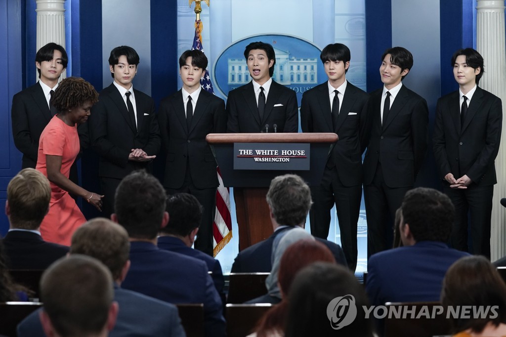 | ▲ 백악관 브리핑룸에 선 BTS (워싱턴 AP=연합뉴스) 세계적인 K팝 스타 방탄소년단(BTS)이 31일(현지시간) 백악관을 방문해 브리핑룸에 섰다. BTS는 미국 '아시아·하와이 원주민·태평양 제도 주민(AANHPI) 유산의 달' 마지막 날인 이날 조 바이든 미국 대통령과 면담하고 '반(反) 아시안 증오범죄 대응 방안'에 대해 의견을 교환했다. 2022. 6. 1. photo@yna.co.kr |