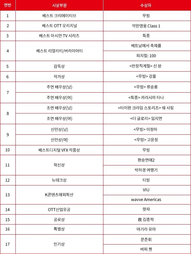 '무빙'은 베스트 크리에이티브상 외에도 베스트디지털 시각특수효과(VFX) 작품상, 작가상(강풀), 남자 주연 배우상(류승룡)을 거머쥐는 쾌거를 이뤘다.
