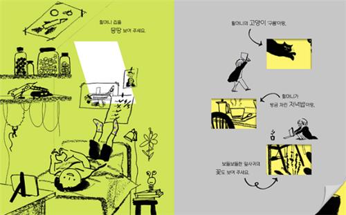 (서울=연합뉴스) 안정훈 기자 = 그림책 표지부터 페이지 곳곳에 아기자기한 구멍이 뚫려 있다. 책 속의 아이는 뻥 뚫린 컴퓨터 모니터 구멍으로 할머니 모습을 보고, 페이지를 넘기자 할머니도 모니터에 난 열린 공간을 통해 훌쩍 자란 손주를 흐뭇하게 바라본다. 모니터, 작은 창문, 편지 봉투 등 포인트가 되는 그림에 뚫은 '다이 컷'을 통해 앞장 그림이 뒷장 그림의 일부가 되며 흥미롭게 연결된다.