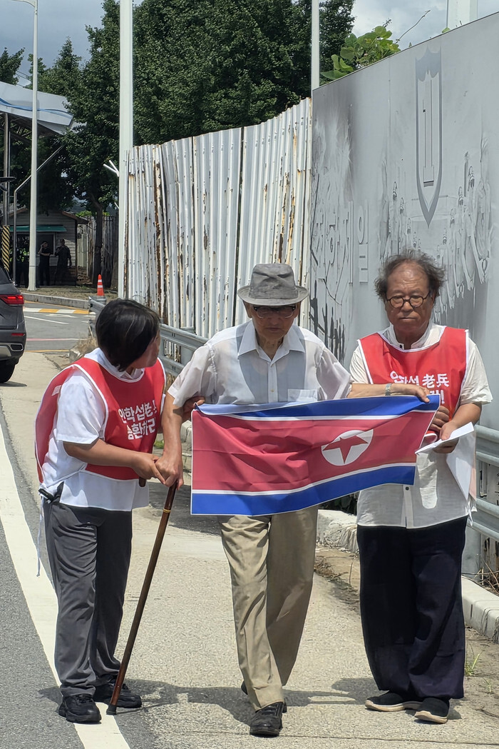 Ahn Hak-sop (C), an unconverted long-term prisoner who did not renounce his allegiance to North Korea for more than 42 years in a South Korean prison, unfurls a North Korean flag near a bridge in the South Korean border city of Paju that leads to the truce village of Panmunjom inside the Demilitarized Zone separating the two Koreas, on Aug. 20, 2025, during a rally organized by a civic group advocating the 95-year-old's repatriation to the North. (Yonhap)