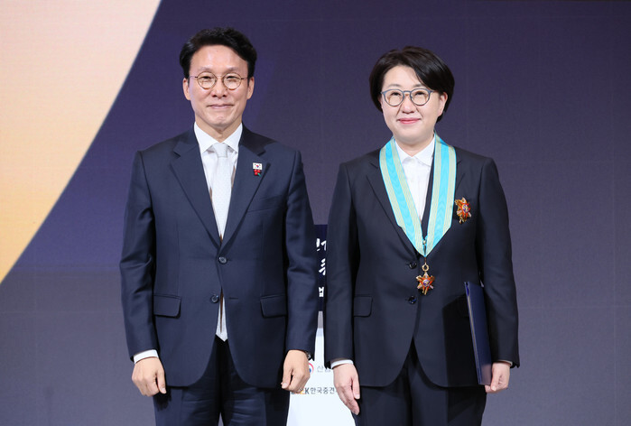 Prime Minister Kim Min-seok (L) poses for a photo with Lee Ji-seon, head of Shinsung E&G Co., a maker of clean room facilities for semiconductors and displays, after conferring the Silver Tower Order of Industrial Service Merit on Lee during a ceremony at a Seoul hotel on Dec. 1, 2025, to mark the 11th anniversary of Middle Market Enterprises' Entrepreneurs Day. (Yonhap)