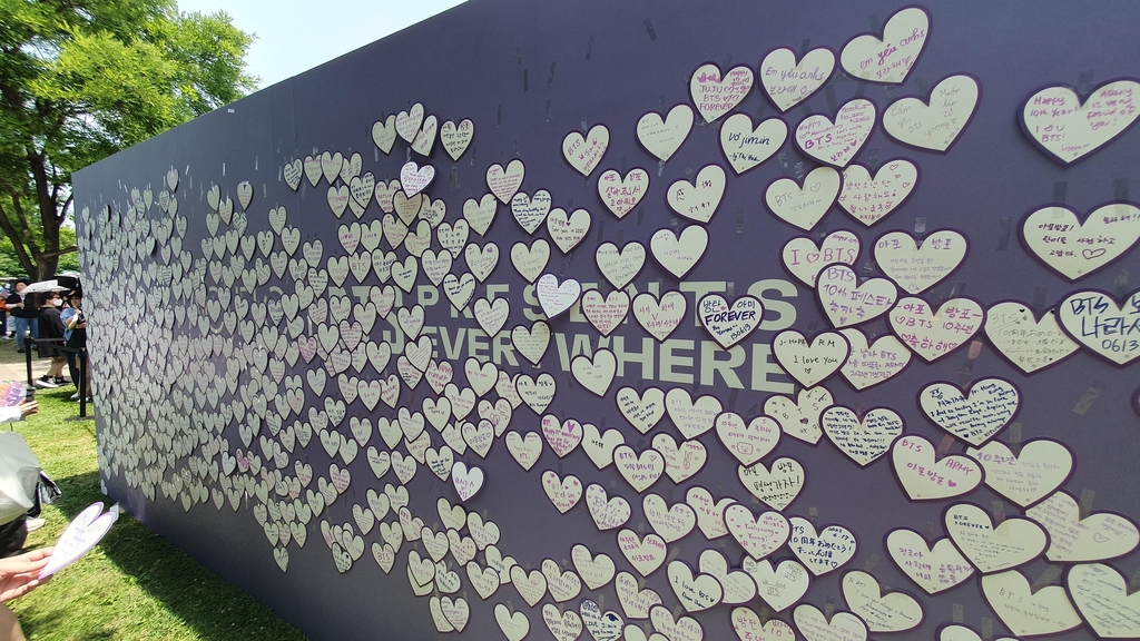 행사장 한쪽에는 팬들이 방탄소년단에게 적은 메모를 붙여 놓는 벽도 마련됐다. 팬들은 한국어, 영어, 중국어, 일본어 등 자신만의 언어로 지난 10년간 함께 달려 온 멤버들에 대한 애정을 아낌없이 드러냈다.