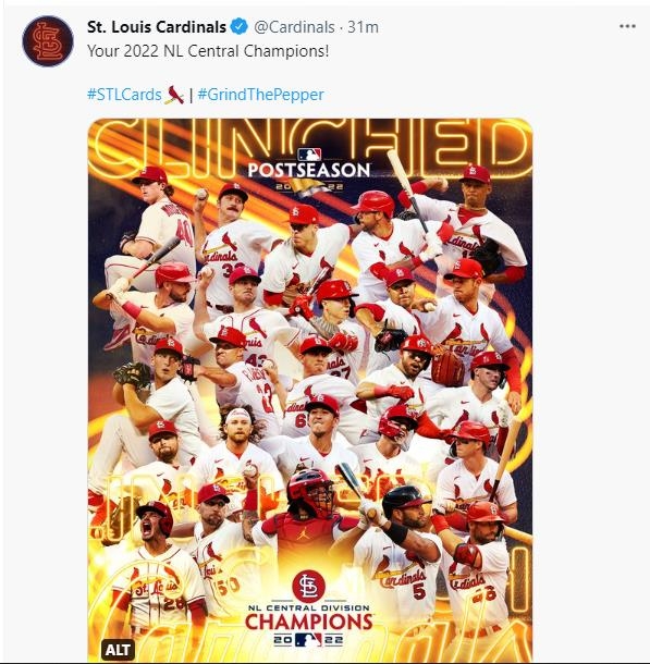 | ▲ 세인트루이스, 3년 만에 NL 중부지구 정상 탈환 [세인트루이스 카디널스 트위터 캡처. 재판매 및 DB금지] |