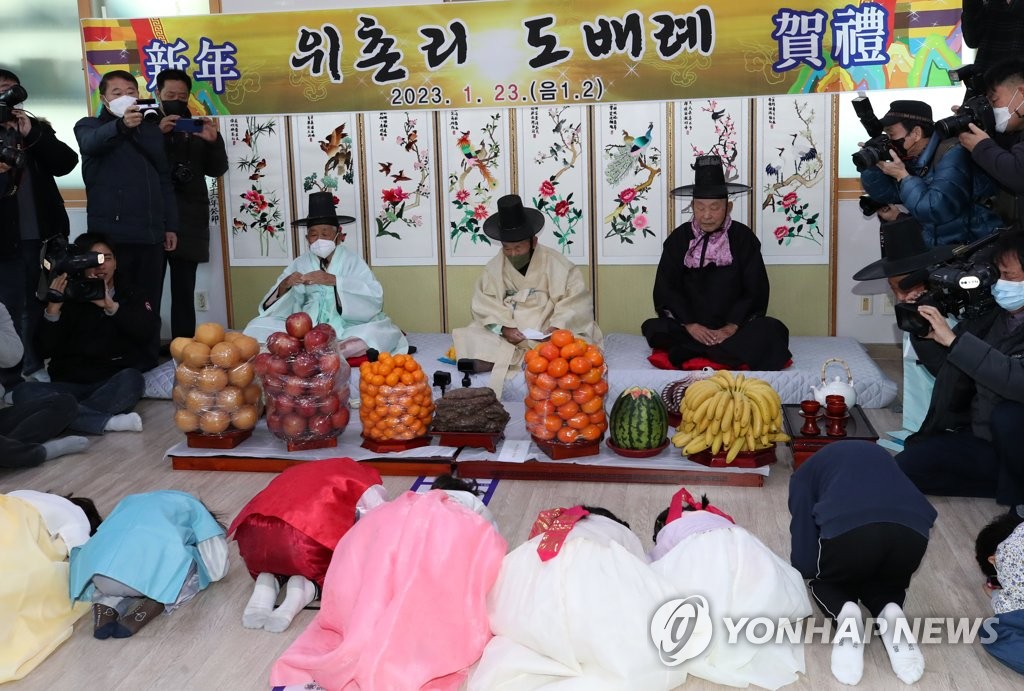 | ▲ 강릉 '위촌리 도배례' 3년 만에 재개 (강릉=연합뉴스) 유형재 기자 = 23일 강원 강릉시 성산면 위촌리 전통문화전승회관에서 마을주민 등 120여 명이 참석한 가운데 코로나19로 중단됐던 440년 넘는 전통의 합동 도배 행사인 '위촌리 도배례'가 3년 만에 열리고 있다. 주민들이 최종춘(96) 마을 촌장 등에게 세배하고 있다. 2023.1.23 yoo21@yna.co.kr |