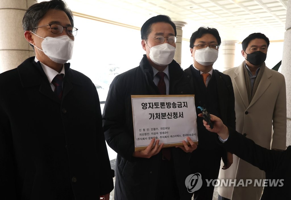 | ▲ 국민의당 대선후보 초청토론 방송금지가처분 신청 (서울=연합뉴스) 백승렬 기자 = 국민의당 이태규 총괄선대본부장이 19일 서울서부지법에 지상파 3사에 대한 대통령후보 초청토론 방송금지가처분 신청서를 제출하기 전 취재진의 질문에 답변하고 있다. 2022.1.19 srbaek@yna.co.kr |