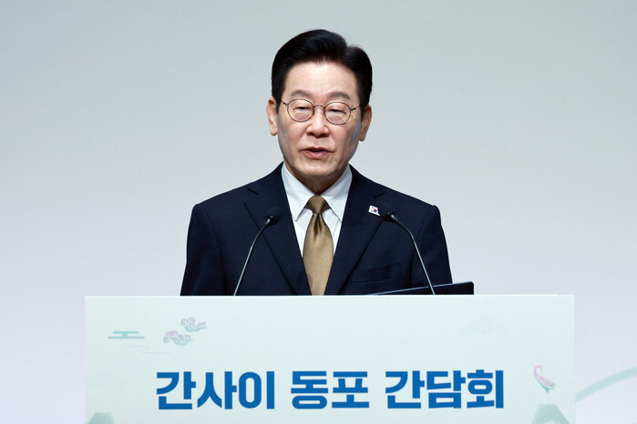 South Korean President Lee Jae Myung speaks in Nara, western Japan, on Jan. 14, 2026, during a meeting with Korean residents living in the western Japan region. (Yonhap)