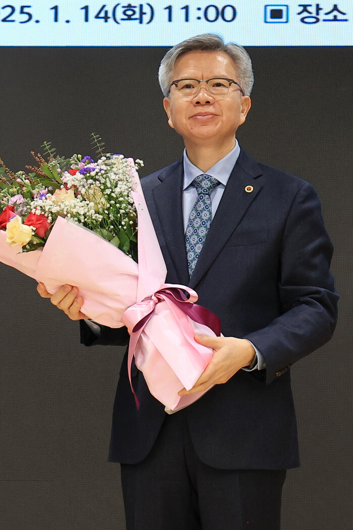 Kim Taek-woo, new head of the Korean Medical Association, holds a bouquet during a ceremony to mark his inauguration at the association's headquarters in Seoul on Jan. 14, 2025. (Yonhap)