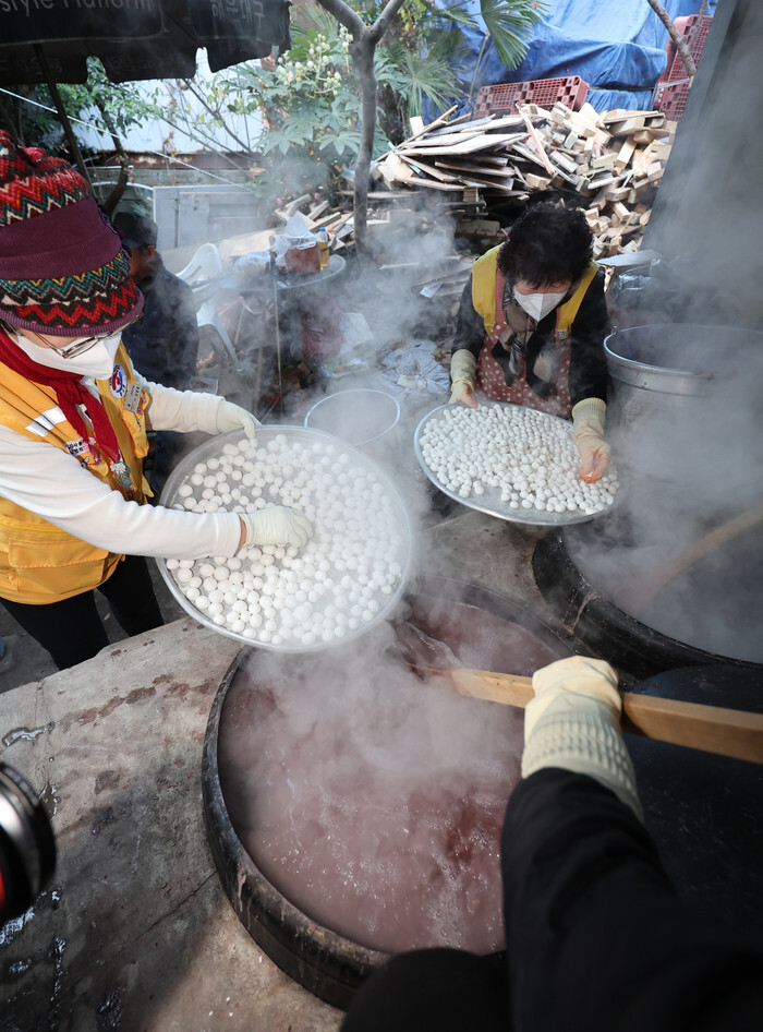 A group of volunteers put egg-shaped dumplings into red bean porridge, called "patjuk," to provide it to impoverished people in the southeastern city of Busan on Dec. 16, 2025, six days ahead of "Dongji," or the winter solstice. The porridge is a favorite Korean dish eaten on Dongji, one of the 24 seasonal divisions of the year, in accordance with the ancient belief that the red color of the beans provides positive energy to drive away evil spirits. (Yonhap)
