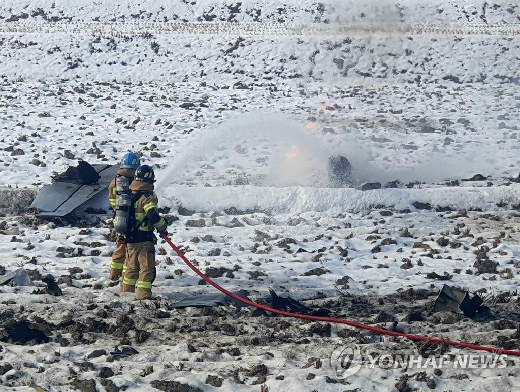 | ▲ Firefighters pour water onto the site of a warplane crash in Hoengseong County, about 140 kilometers east of Seoul, on Dec. 26, 2022, in this photo released by the fire service in the county. (PHOTO NOT FOR SALE) (Yonhap) |