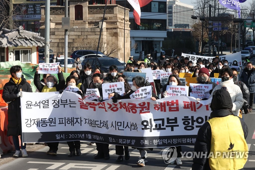 | ▲ A group of progressive activists marches toward the foreign ministry in Seoul on Jan. 18, 2023, to convey their letter of protest against the South Korean government's solution for addressing the issue of compensation for wartime forced labor. (Yonhap) |