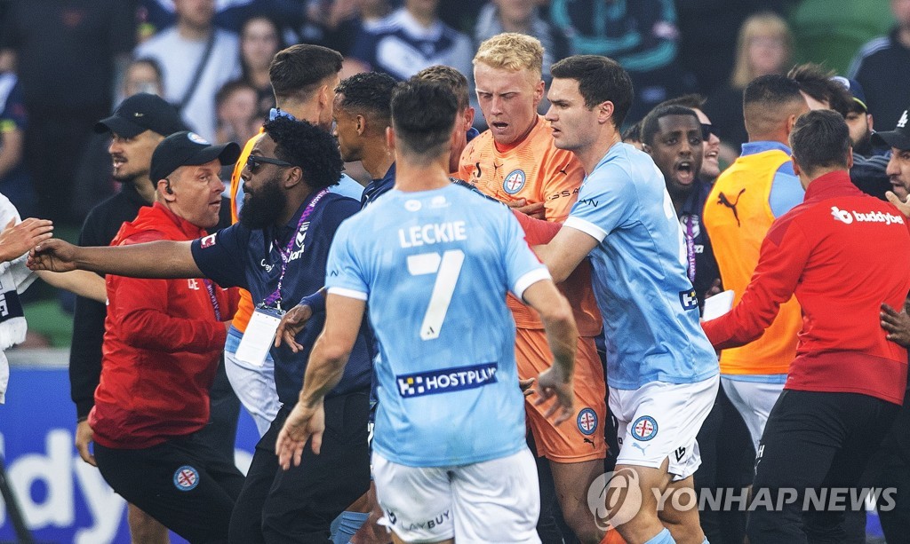 (서울=연합뉴스) 김동찬 기자 = 호주 프로축구 A리그 경기 도중 팬들이 경기장으로 난입하고, 선수가 얼굴을 다쳐 피를 흘리는 등의 사태가 벌어졌다.