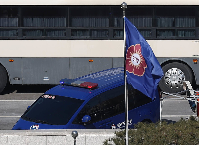 A Ministry of Justice vehicle (blue) carrying arrested President Yoon Suk Yeol arrives at the Constitutional Court in Seoul on Feb. 18, 2025, as Yoon will attend the ninth hearing of his impeachment trial for his short-lived imposition of martial law in December. (Yonhap)