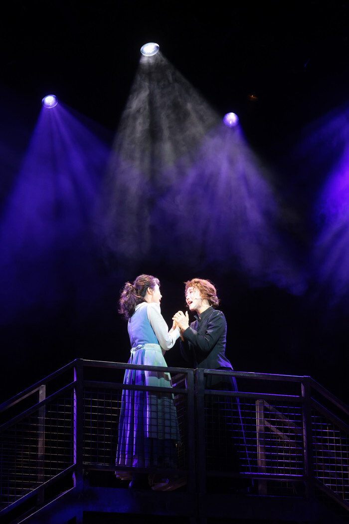 South Korean actresses Kim So-hyang (R) and Lee Bomsori, who star in the musical "Marie Curie," perform during a publicity event in Seoul on Aug. 7, 2025. The musical runs from July 25 to Oct. 19. (Yonhap)