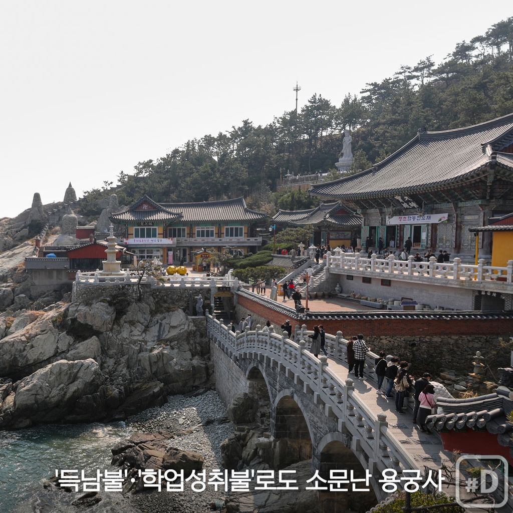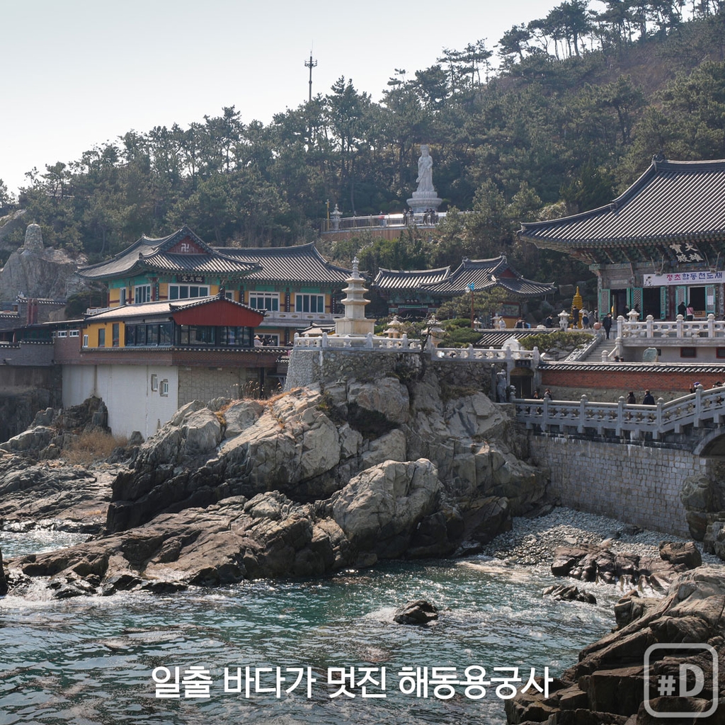 기장읍 해동용궁사는 바닷물이 바로 발아래 철썩이는 사찰입니다. 고려 말기 창건된 절로, 일출 풍경이 멋진 곳으로 알려졌죠. 영험 있는 득남불, 학업성취불로도 소문났다고 합니다.