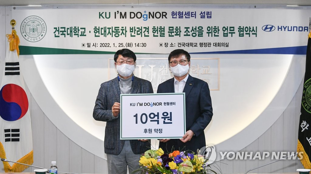 | ▲ 현대차-건국대, 반려견 헌혈 문화 조성 MOU (서울=연합뉴스) 지난 25일 서울 건국대학교에서 열린 '반려견 헌혈 문화 조성을 위한 업무 협약식'에서 유원하 현대자동차 국내사업본부 부사장(왼쪽)과 전영재 총장이 후원 약정을 마친 후기념 촬영을 하고 있다. 2022.1.26 [현대차 제공. 재판매 및 DB 금지] photo@yna.co.kr |
