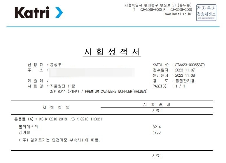 | ▲ 프리미엄 캐시미어 머플러(M014)의 혼용률 시험성적서 지난 8일 한국의류시험연구원에서 발급한 할렌의 원단 혼용률 검사 결과 폴리에스터는 82.4%, 레이온 17.6%로 파악됐다. [촬영 윤성우] |