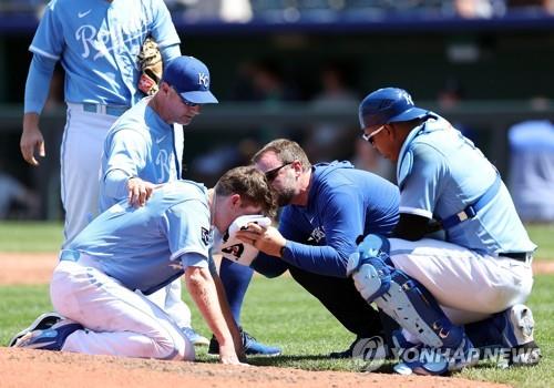 (서울=연합뉴스) 천병혁 기자 = 미국프로야구 캔자스시티 로열스의 투수 라이언 야브로(31)가 총알 같은 직선 타구에 얼굴을 맞고 쓰러져 큰 우려를 자아내고 있다.
