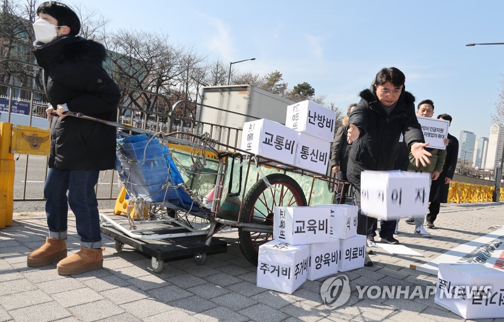 | ▲ 서민 잡는 '난방ㆍ이자ㆍ교육ㆍ통신ㆍ식비' (서울=연합뉴스) 한상균 기자 = 중소상인, 자영업자, 시민단체들이 22일 용산 대통령실 인근에서 가계 부담 긴급대책 촉구 회견 후 난방비 등에 힘든 서민을 표현하고 있다. 2023.2.22 xyz@yna.co.kr |