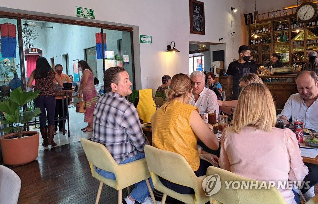 | ▲ 세르반티노 축제 한식 식당 '북적' (과나후아토=연합뉴스) 이재림 특파원 = 14일(현지시간) 멕시코 과나후아토에서 열린 세르반티노 축제에서 관람객들이 한국의 집 내 식당에서 점심을 먹고 있다. 2022.10.15 walden@yna.co.kr |