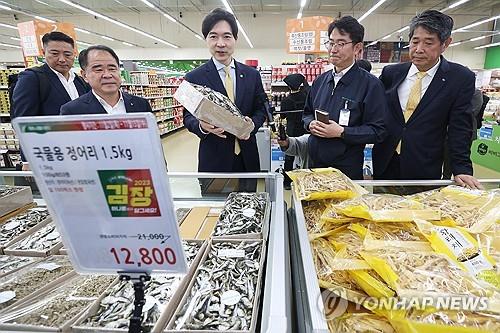 | ▲ Vice Oceans Minister Park Sung-hoon (C) checks prices of seafood at a discount chain store in Seoul on Nov. 2, 2023. (Yonhap) |