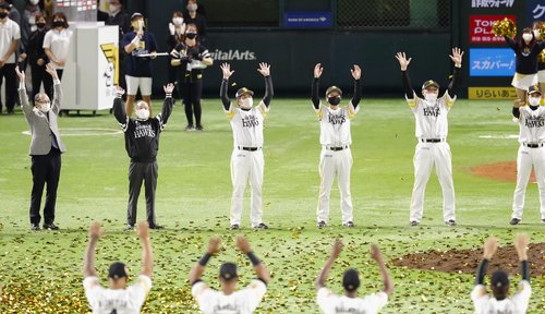 | ▲ 우승한 소프트뱅크 "만세" (후쿠오카 교도=연합뉴스) 소프트뱅크 호크스 프런트와 선수들이 10월 27일 일본 후쿠오카 페이페이돔에서 열린 지바롯데 마린스와의 홈경기에서 5-1로 승리, 퍼시픽리그 정규시즌 우승을 확정한 뒤 마운드 근처에서 만세를 외치고 있다. |