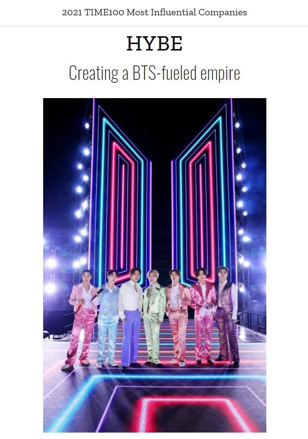 타임은 하이브에 대해 "2005년 설립된 하이브(옛 빅히트 엔터테인먼트)는 경쟁이 치열한 한국 음악 업계에서 한때 '언더독' 기획사였지만, 현재는 세계에서 가장 인기 있는 슈퍼그룹 방탄소년단에 힘입어 고공행진 중"이라고 평가했다.