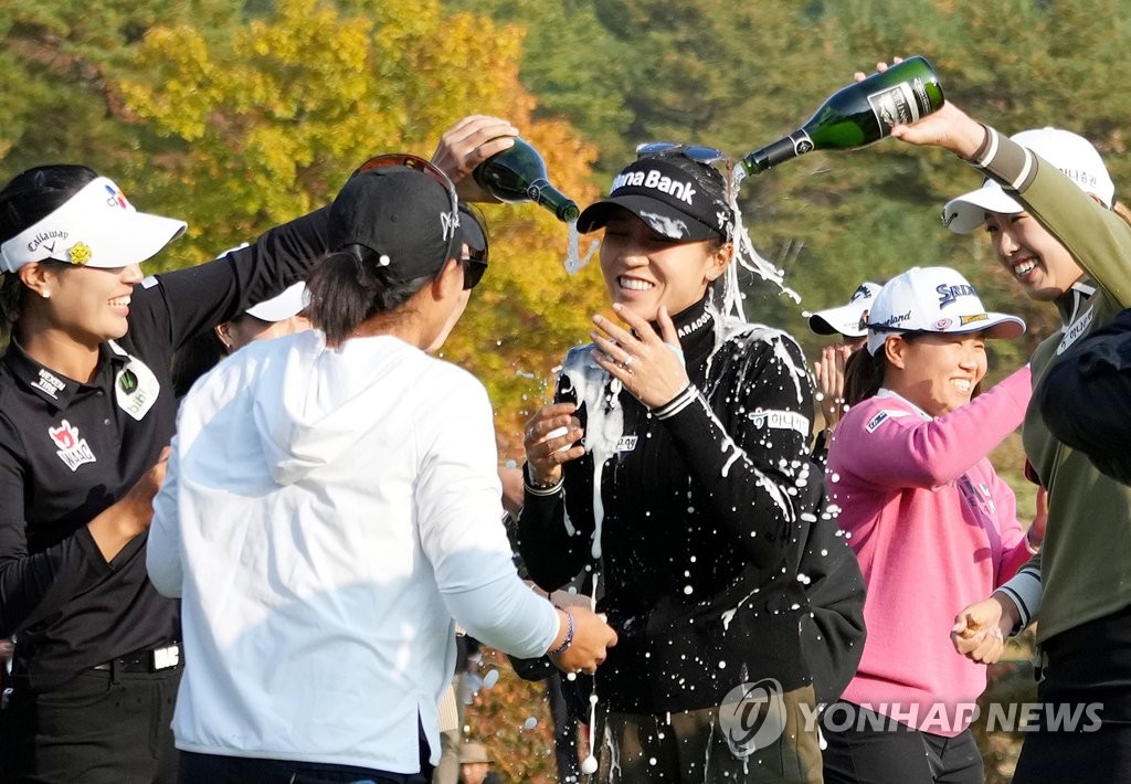 | ▲ 리디아 고, BMW 레이디스 챔피언십 우승 (서울=연합뉴스) 뉴질랜드 교포 리디아 고가 23일 강원도 원주 오크밸리 컨트리클럽에서 열린 대회 4라운드까지 최종합계 21언더파 267타를 기록, 우승한 뒤 동료 선수들의 축하를 받고 있다. 2022.10.23 [BMW 코리아 제공. 재판매 및 DB 금지] photo@yna.co.kr |