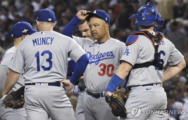 | ▲ 투수 교체하는 데이브 로버츠 다저스 감독(가운데) [UPI=연합뉴스] |