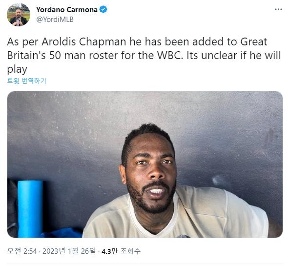쿠바 야구 전문 매체인 페롤타 쿠바나의 요르다노 카르모나 기자는 26일(한국시간) 사회관계망서비스(SNS)에 "채프먼에 따르면, 채프먼이 오는 3월 열리는 5회 월드베이스볼클래식(WBC) 영국대표팀 50명 '관심 선수' 명단에 이름을 올렸다"며 "그가 실제 영국 대표로 뛸지는 불분명하다"고 썼다.