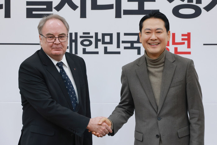 Jang Dong-hyeok (R), chief of the main opposition People Power Party, shakes hands with Australian Ambassador to South Korea Jeff Robinson during their meeting at the National Assembly in Seoul on Dec. 16, 2025. (Yonhap)