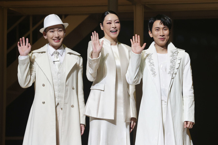 The stars of the musical "Gwanghwamun Love Song" -- Kim Ho-young, Cha Ji-yeon and Seo Eun-kwang (L to R) -- pose for a photo during a publicity event in Seoul on Oct. 29, 2024. The musical runs from Oct. 23 to Jan. 5. (Yonhap)