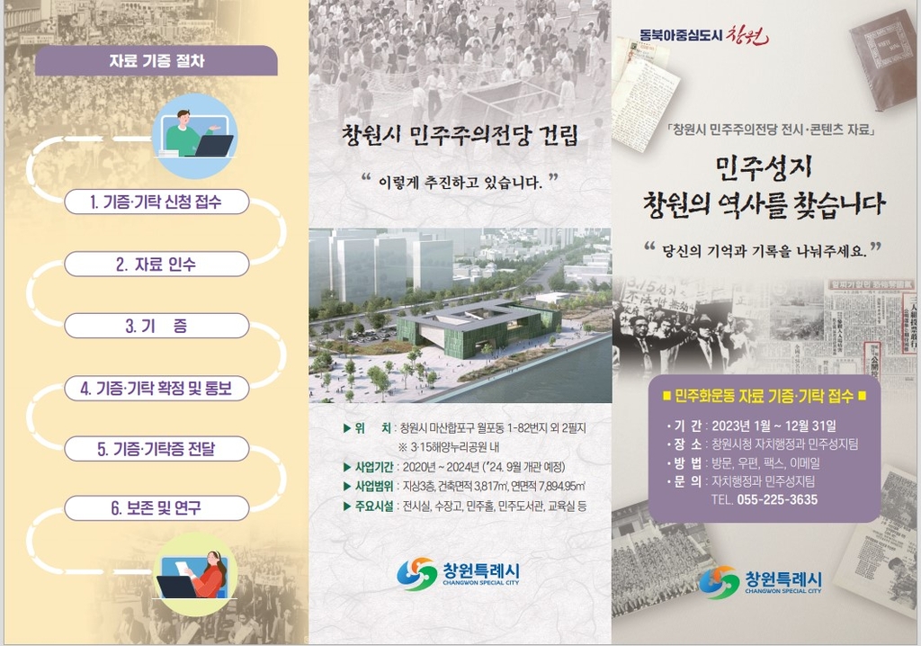 창원시 관계자는 "창원지역에서 발생한 3·15 의거, 4·19 혁명, 부마민주항쟁, 6·10 항쟁 등 민주화운동 관련 역사적 사건과 연관된 자료를 보관하고 있는 개인 또는 단체로부터 기증·기탁 신청을 받는다"며 "수집된 자료는 민주주의전당 전시관이나 수장고에 소장해 연구자료로 활용할 예정"이라고 말했다.