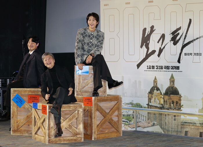 The stars of the new movie "Bogota: City of the Lost" -- Lee Hee-jun, Kwon Hae-hyo and Song Joong-ki (L to R) -- pose for a photo during an event in Seoul on Dec. 6, 2024, to promote the movie, set to hit local screens in South Korea on Dec. 31. (Yonhap)