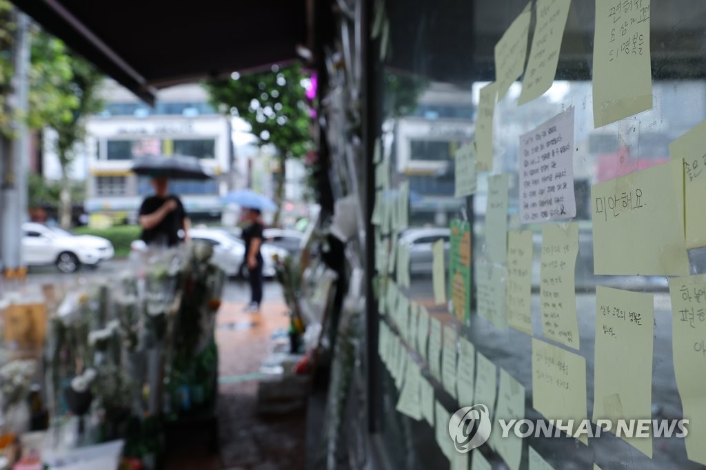 ▲ Flowers and messages of condolences are laid out at a makeshift memorial in an alley near Sillim Station in this file photo taken July 23, 2023, where a man was killed and three others wounded in a stabbing rampage on July 21. (Yonhap)
