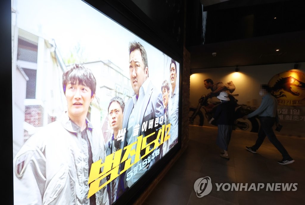 | ▲ 관객 1천만 돌파한 '범죄도시2' (서울=연합뉴스) 박동주 기자 = 마동석·손석구 주연의 범죄액션 영화 '범죄도시 2'가 11일 관객수 1천만 명을 돌파했다. 코로나19 엔데믹(전염병의 풍토병화) 시대 들어 첫 천만영화다. 사진은 이날 오후 서울 시내 한 영화관. 2022.6.11 pdj6635@yna.co.kr |