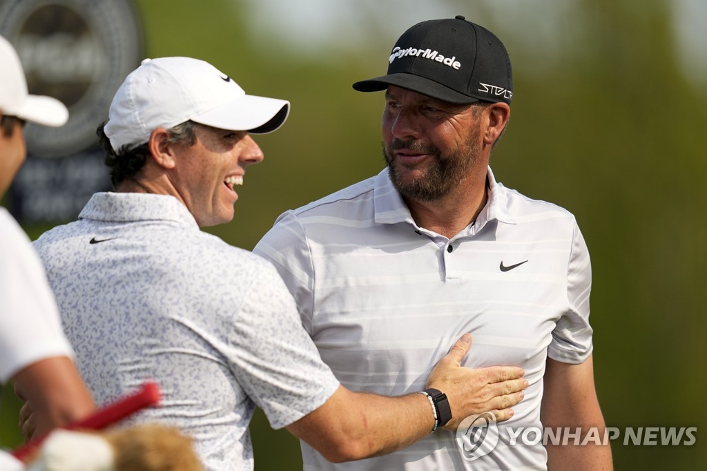 ▲ 홀인원 뒤 매킬로이의 축하 받는 블록 [AP=연합뉴스]