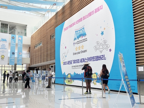 (부안=연합뉴스) 김진방 임채두 기자 = 영국과 미국 스카우트 대표단의 조기 퇴소 결정으로 2023 새만금 세계 스카우트 잼버리 각국 대표단의 '도미노 이탈'이 예상되는 가운데 잼버리 야영장은 침통한 분위기가 흘렀다.