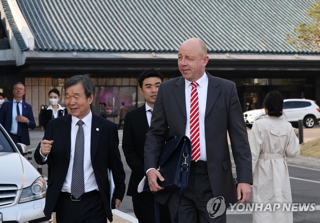 | ▲ Patrick Specht (R), president of the Bureau International des Expositions (BIE) Administration and Budget Committee, leaves his lodging in Seoul on April 3, 2023, to meet with Industry Minister Lee Chang-yang. (Yonhap) |