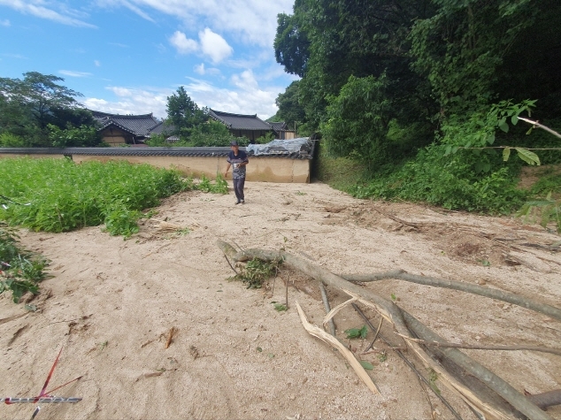 | ▲ 국가민속문화재 '봉화 만회고택' 피해 상황 주변 산사태로 담장 쪽으로 퇴적물이 유입된 모습 [문화재청 제공. 재판매 및 DB 금지] |