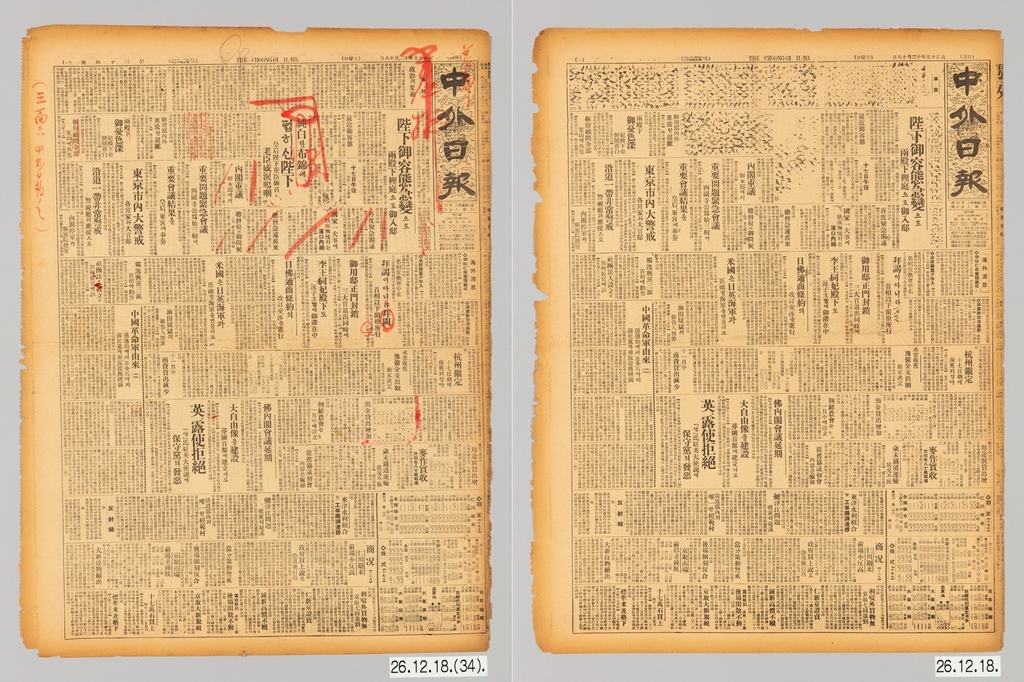 일례로 1926년 12월 18일 자로 발행된 34호의 1면은 일왕의 건강을 다뤘다는 이유로 일부 기사가 삭제된 경우다.