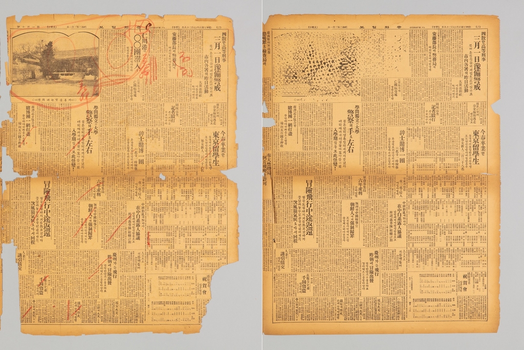 | ▲ '중외일보' 107호(2면) 검열본과 삭제본 비교 검열본(왼쪽)과 삭제본(오른쪽)을 비교해보면 좌측 상단에 있던 기사가 삭제돼 배포된 것을 알 수 있다. 1927년 3월 1일에 발간 예정이던 이 신문에는 1919년 3월 1일 민족대표 33인이 독립선언서를 낭독했던 태화관의 사진 기사가 실렸지만 삭제된 후 배포됐다. [대한민국역사박물관 제공. 재판매 및 DB 금지] |
