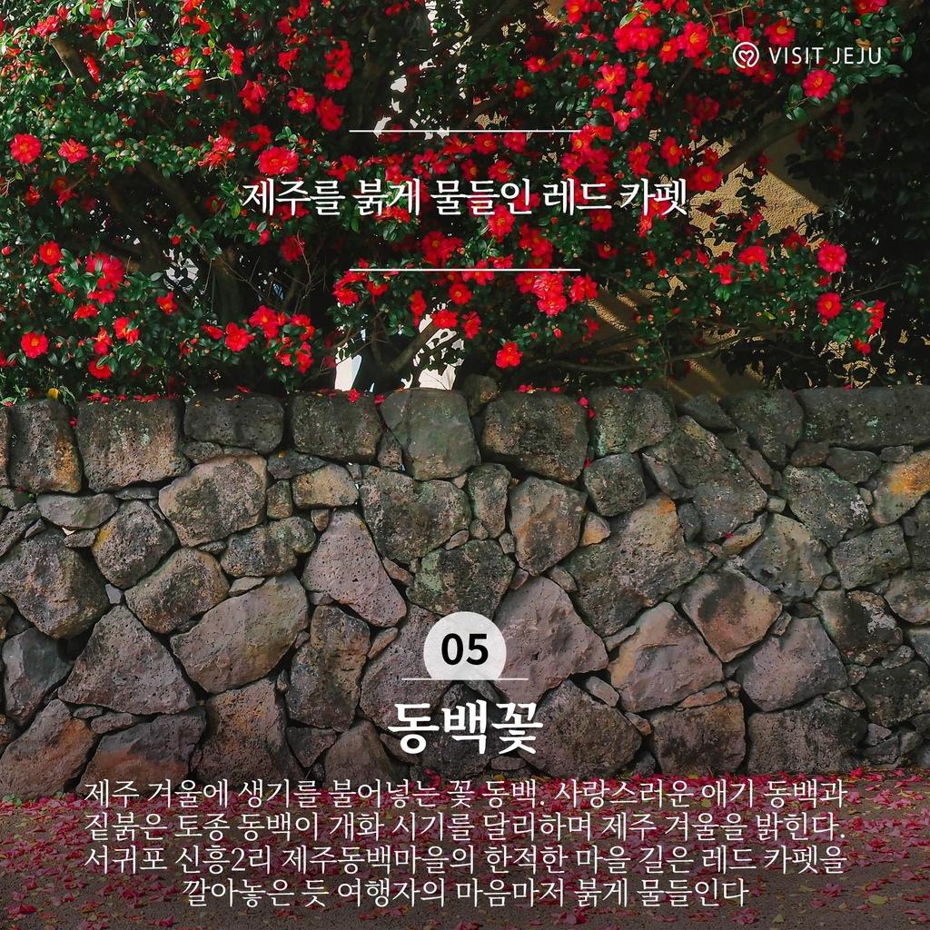 제주 겨울에 생기를 불어넣는 붉은색의 동백꽃 관광 명소도 추천 대상이다.